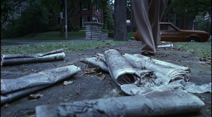 In addition to these and other extended shots of the house, Coppola and Lachman often frame shots in a manner which foregrounds or isolates objects which function as signifiers of the Lisbons. The arrival of a local television reporter at the Lisbons’ home, for instance, is shot at a low angle which reduces the reporter to a secondary figure, instead foregrounding the unread newspapers accumulating upon their front porch which function as a shorthand for the increasingly isolated Lisbons. Lingering shots of objects belonging to the Lisbons not only visually imply the narrator’s curatorial project, but their kinetic stasis both accentuates the felt lack of the Lisbon sister as well as recalls the aesthetics of still photography. Elsewhere in the film, as she does when she introduces the sisters one by one, Coppola temporarily freezes the image track, as though the narrator were trying to pluck and preserve ephemeral moments; that she always reanimates the image suggests the impossibility of doing so.