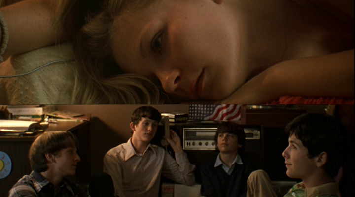 There is a precedent for this interpretation of the songs as a form of narrative shorthand to be found within the diegesis, specifically in a sequence late in the film wherein the boys and the Lisbon sisters play songs to each other over the phone. After Mrs. Lisbon confines her daughters to their house, the boys look them up in the telephone book and call them; when the girls answer the phone, the boys play them Todd Rundgren’s “Hello, It’s Me,” initiating a back and forth in which the girls express their isolation through Gilbert O’Sullivan’s “Alone, Again,” the boys enlist the Bee Gees to urge the girls to “Run to Me,” and the girls finally resign themselves to being “So Far Away,” with help from Carol King. Coppola uses a horizontal split screen to unite the boys and the girls on screen within their shared temporal moment, even as the bifurcation of the image stresses their physical remoteness; she frames the girls tighter than she does the boys, as though there’s only a finite range of information which can fit through a telephone line. There are also several closeups of the turntable cartridge gliding across the spinning vinyl, visually anchoring the aural signifiers heard on the soundtrack throughout the course of the film. By stressing not only the music but its physical medium, the film underscores the fixity of its temporal duration and gives greater valence to the audio track. Thus, it follows that the image can be considered subordinate to the soundtrack in general, just as it is thought to be conjured by the narrator’s telling of the tale.