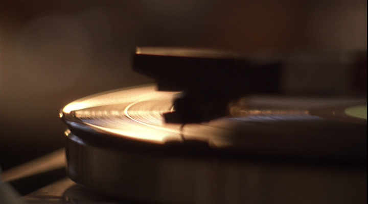 Another way in which Coppola suggests an indexical referent that remains partially obscured to the audience is in her treatment of extra-diegetic music. Unlike the score by Air, which eases in and out of the audio track smoothly and with no aural anomalies or “surface noise,” whenever a pop or rock song from the era in which the film is set plays on the soundtrack, it is preceded by the sound of a turntable cartridge making contact with a vinyl record; additionally, the scratches and pops common to the vinyl format are audible throughout the duration of the music. This needle-drop approach to the film’s song track foregrounds the music’s physical form as a 33 or 45rpm vinyl record, suggesting each song’s concrete existence outside of the discourse as a tangible object within the boys’ “collection of souvenirs.” As the needle drops and a song begins, it is as though the narrator has placed a record on the turntable and is playing it for the audience in an illustrative context, just as he/they may display a photograph or read a quotation. Over a summary of Trip Fontaine’s sexual prowess, for instance, depicted visually by a montage of pseudo-iterative shots (Trip floating in a pool, Trip welcoming a female classmate into his house, Trip flirting with the school secretary), the song “Magic Man” by Heart conveys more immediately and vividly Trip’s je ne sais quoi than a traditional voice over would be able to.